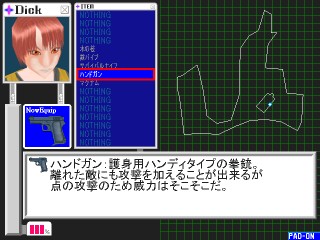 ![]() アイテム画面で武器の選択。 襲い掛かってくる敵もこれらで対抗できるであろうか。 それはプレイヤーの腕にかかっている! |