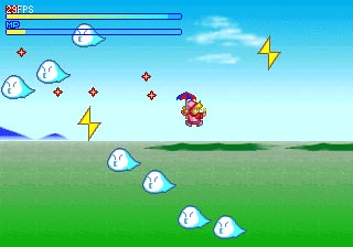 ステージ1お天気の国。 今回は雲や雷が編隊を組んだり コンビネーション攻撃をしたりするぞ! とりあえずここで敵の弾をガード吸収をして パワーアップをしよう! |